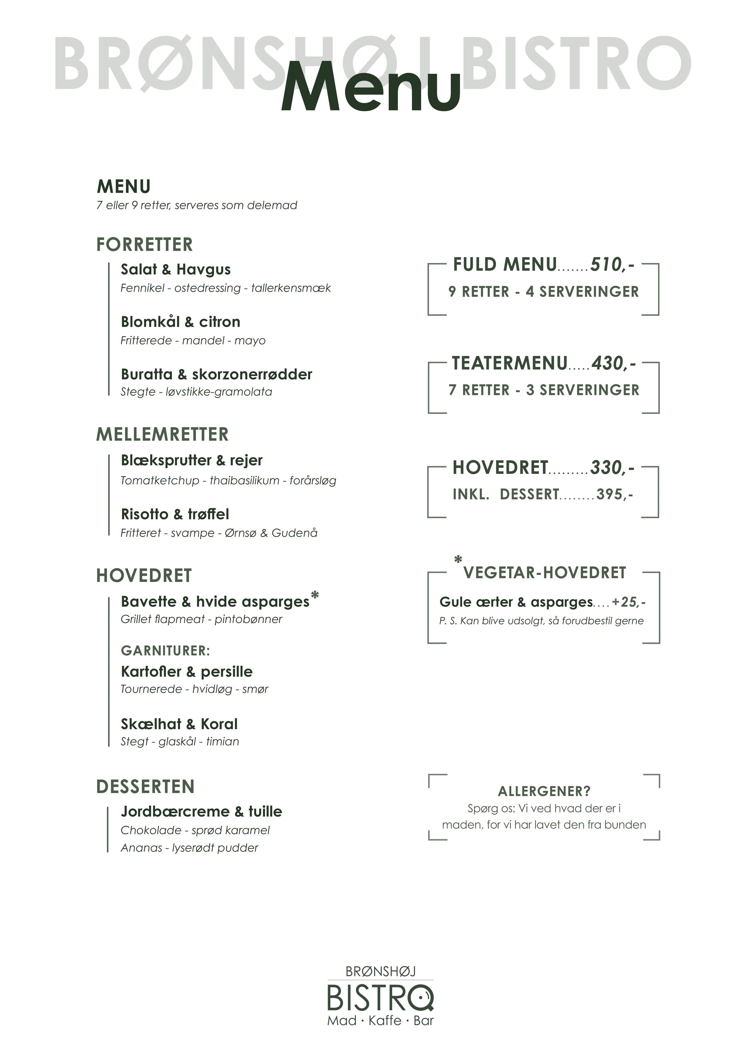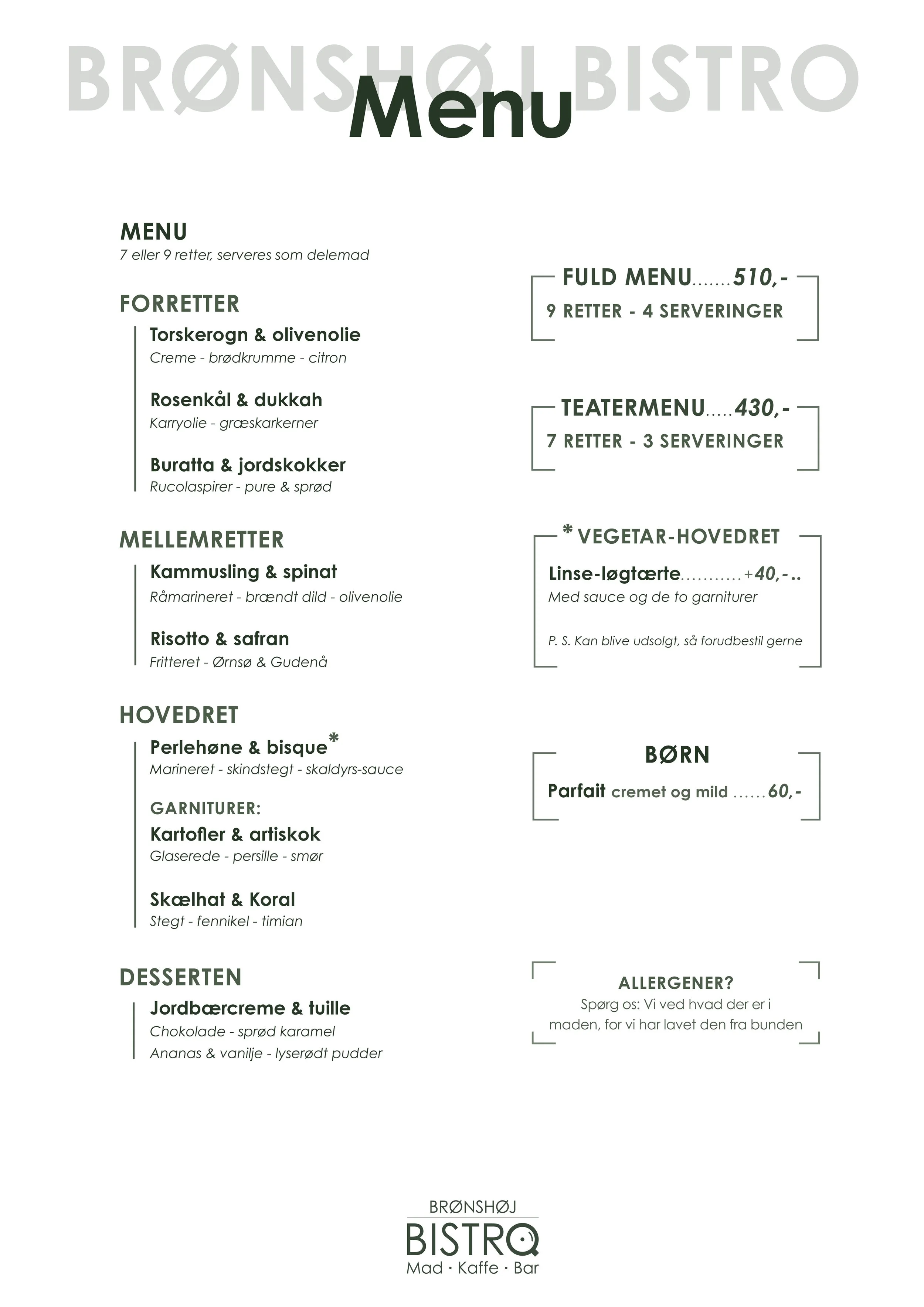 Den Fulde Menu har en lille søskend: “Teatermenuen” som er forretterne, hovedretten og desserten, så antallet af retter og mængden af mad er mindre.