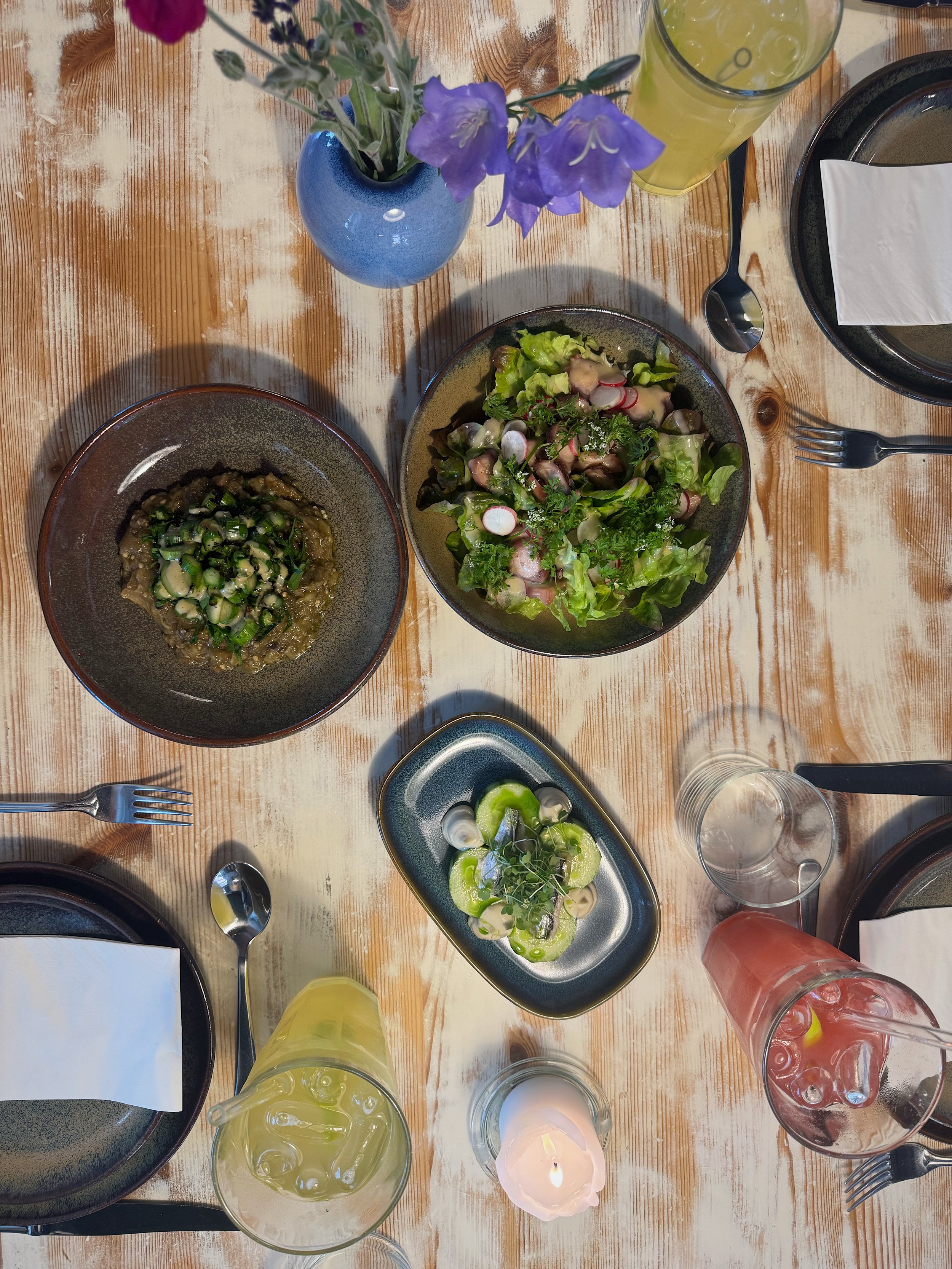 Alle retter serveres som “dele-mad” og stilen er enkel og årstidsbestemt.